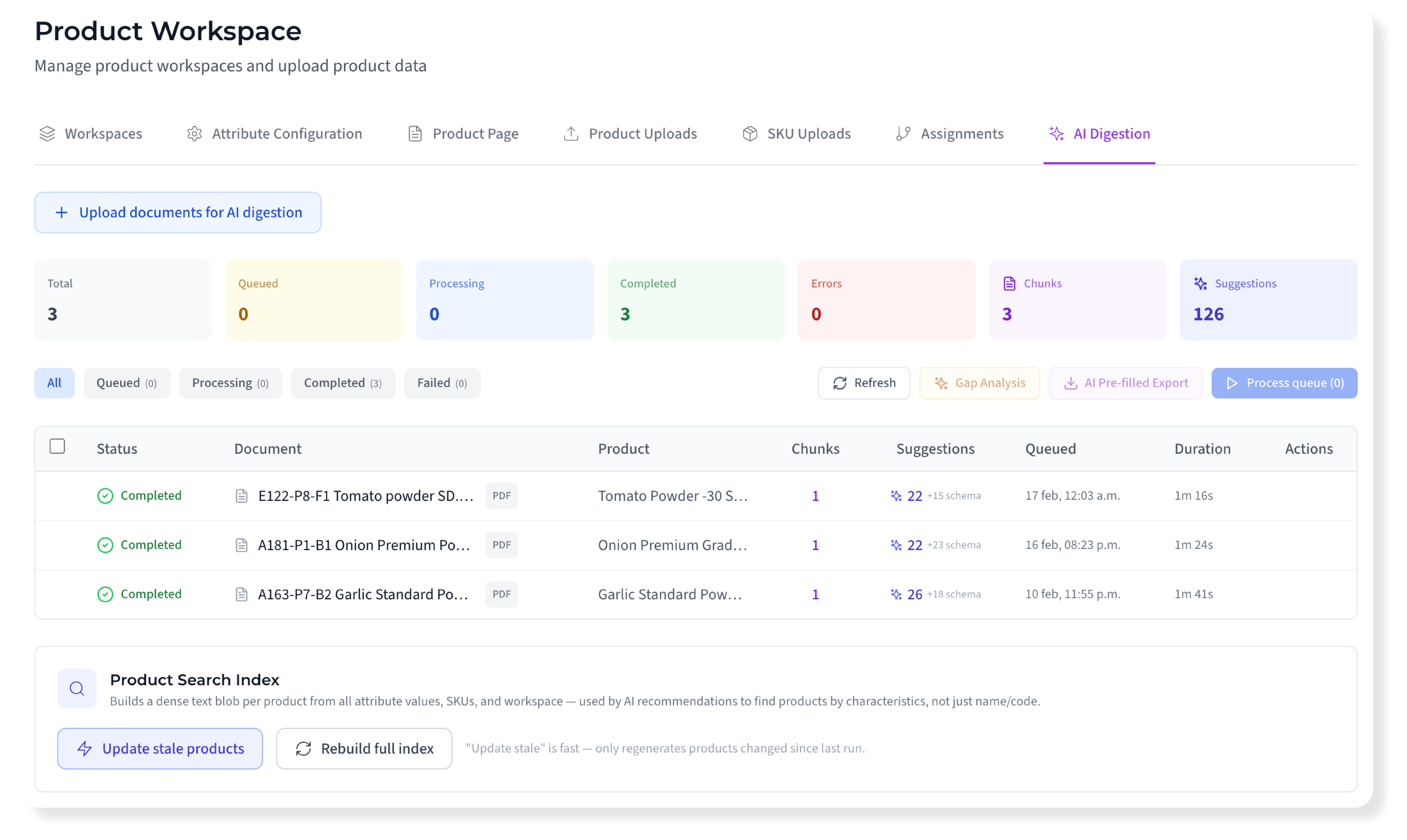 Product data arrives as PDFs (TDS, SDS, COA) from hundreds of suppliers. Manual entry takes weeks and introduces errors.