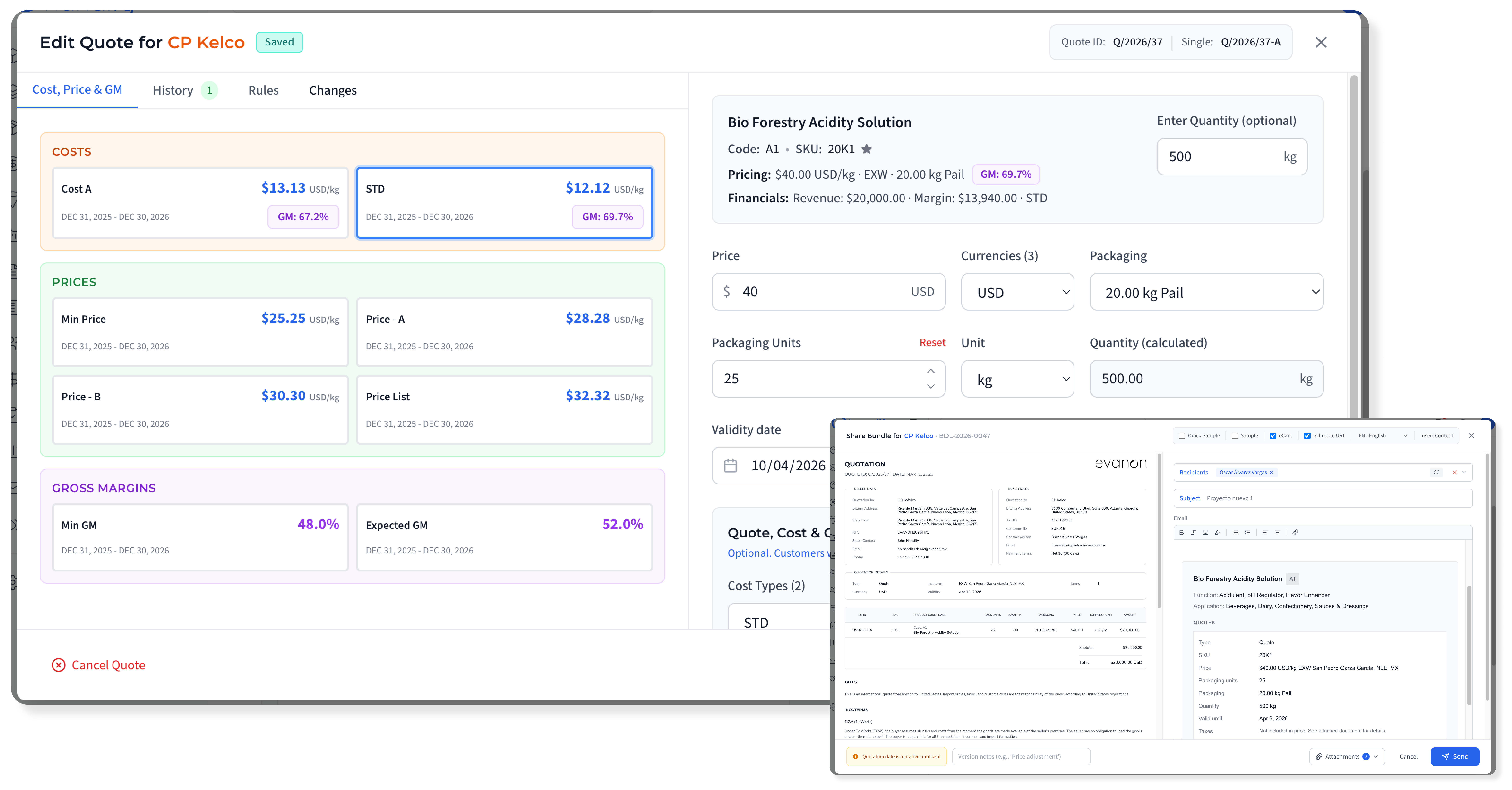 Your quotes pull from the product catalog with tax intelligence, trigger supply chain flows via incoterms, apply category manager rules, attach to pipeline deals, and reference sample and price history — all in one system.