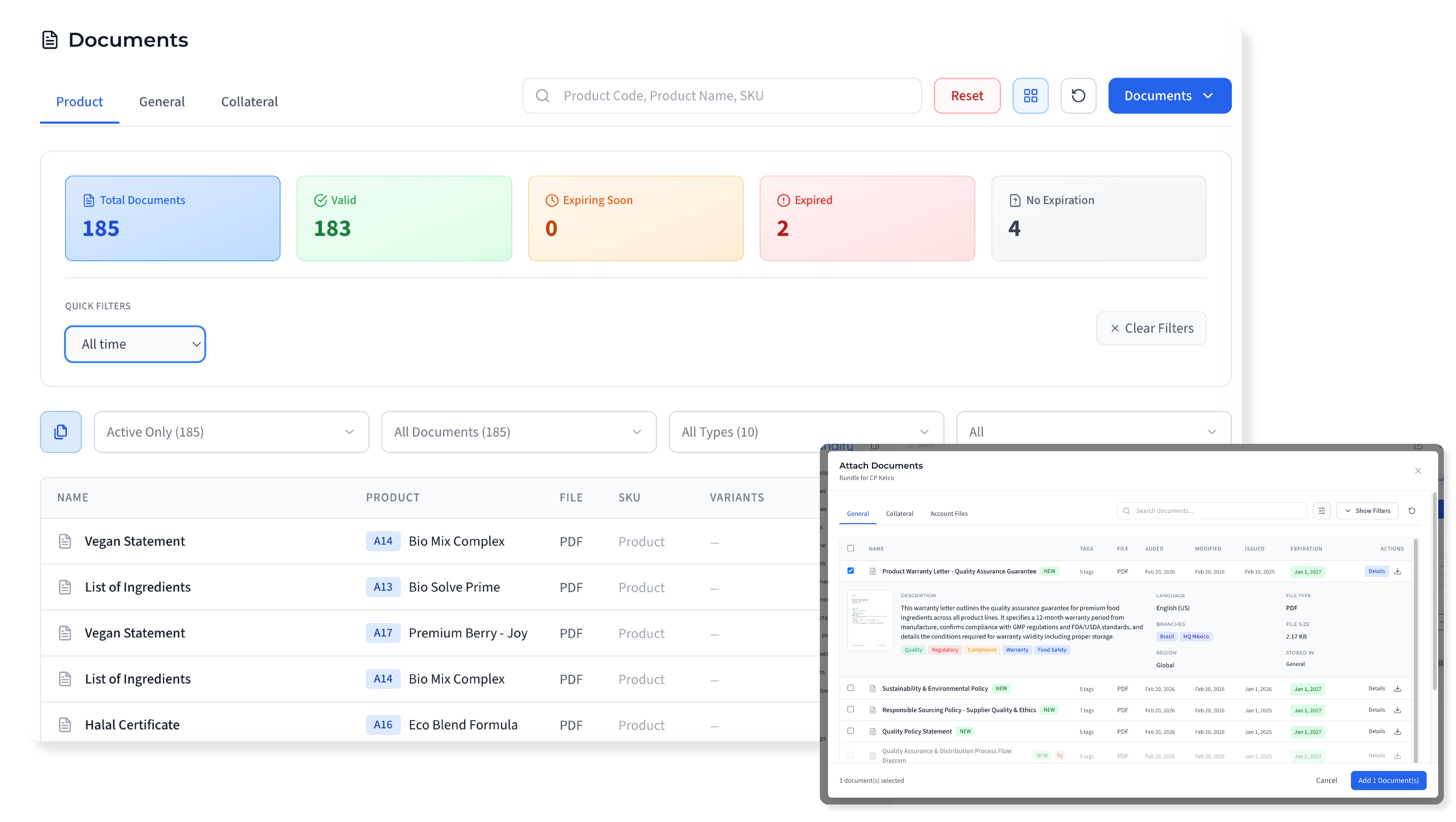 Upload hundreds or thousands of documents at once. AI reads each file, identifies the product, document type, issue date, and expiration date — then organizes everything automatically. No manual tagging, no one-by-one uploads.