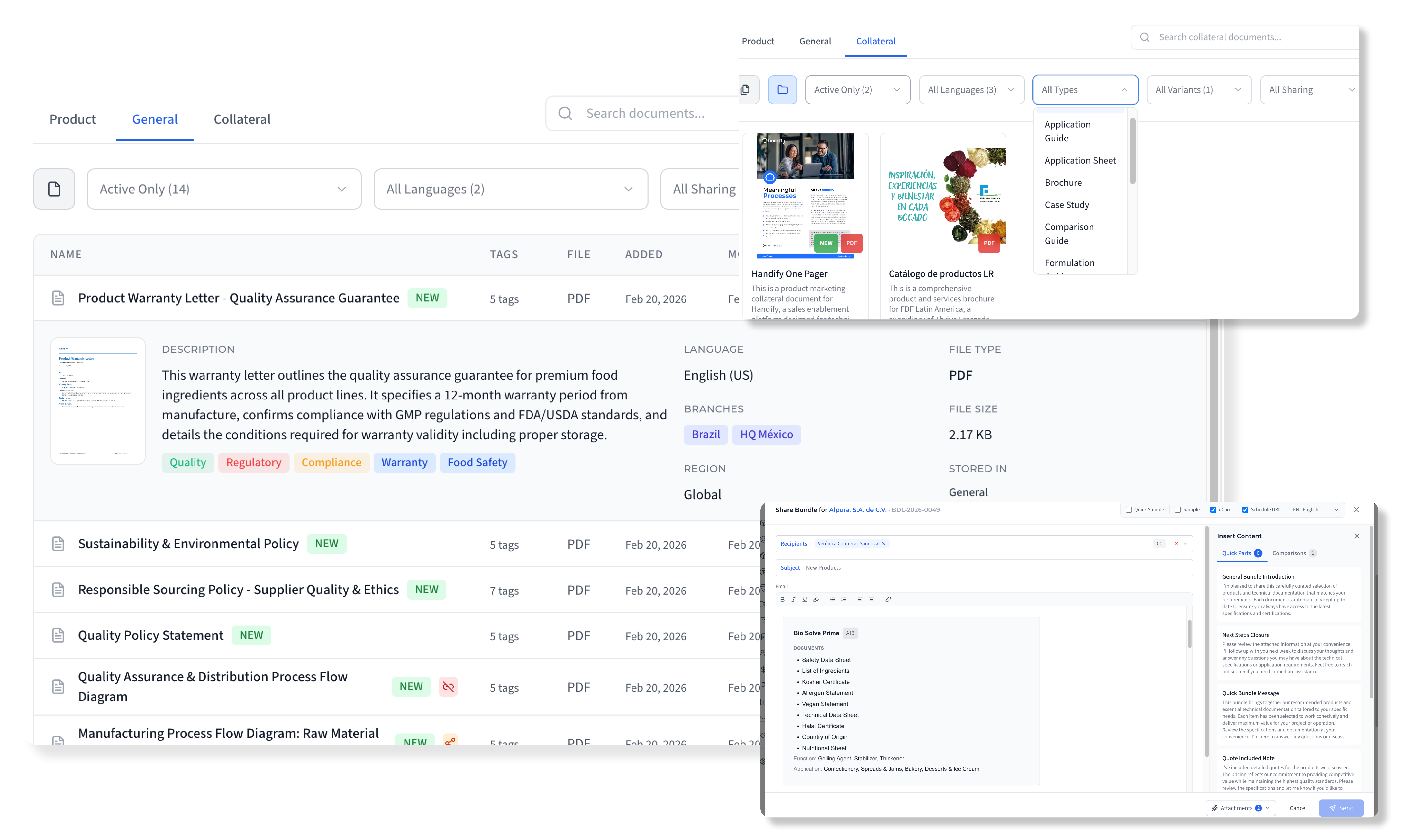 Food ingredient sales teams juggle product specifications, allergen declarations, certifications (Halal, Kosher, organic), regulatory documents, and marketing collateral for hundreds of products across dozens of client presentations. handify bundles bring all of this together: your food ingredient catalog, its technical documents, and your marketing content in one shareable link. When you update a COA or certification, every bundle that includes it updates automatically — so reps stop spending half their day on document assembly.