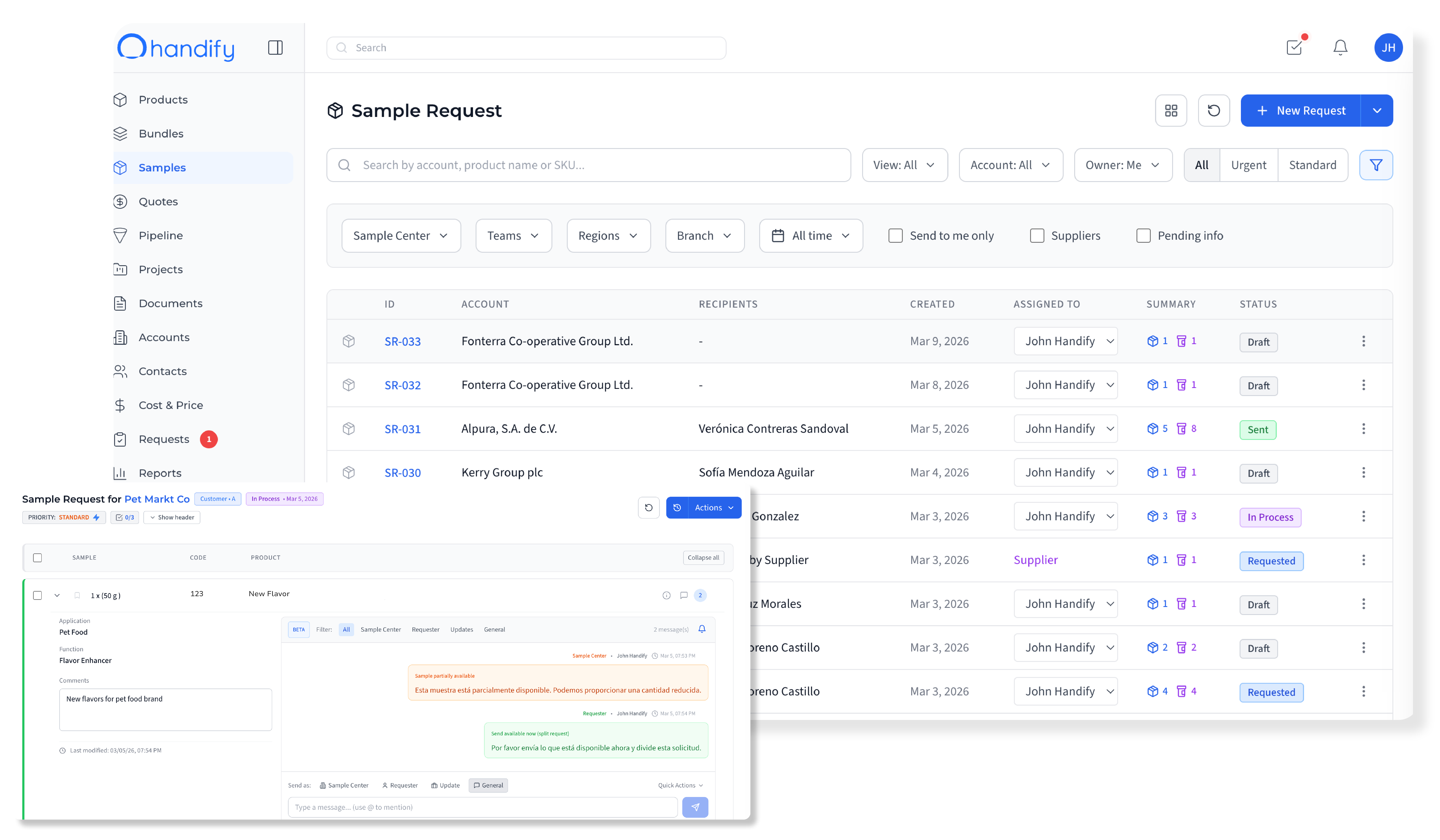 Most food ingredient companies track samples through spreadsheets, shared folders, and email — losing visibility the moment a sample leaves the building. handify provides end-to-end sample management built for food ingredient workflows: requests link to accounts and pipeline opportunities, products carry allergen and certification data that flows into sample documentation, and evaluation feedback connects back to the opportunity. Managers see all active samples across all sample centers in real time, and the system generates dispatch documentation automatically.