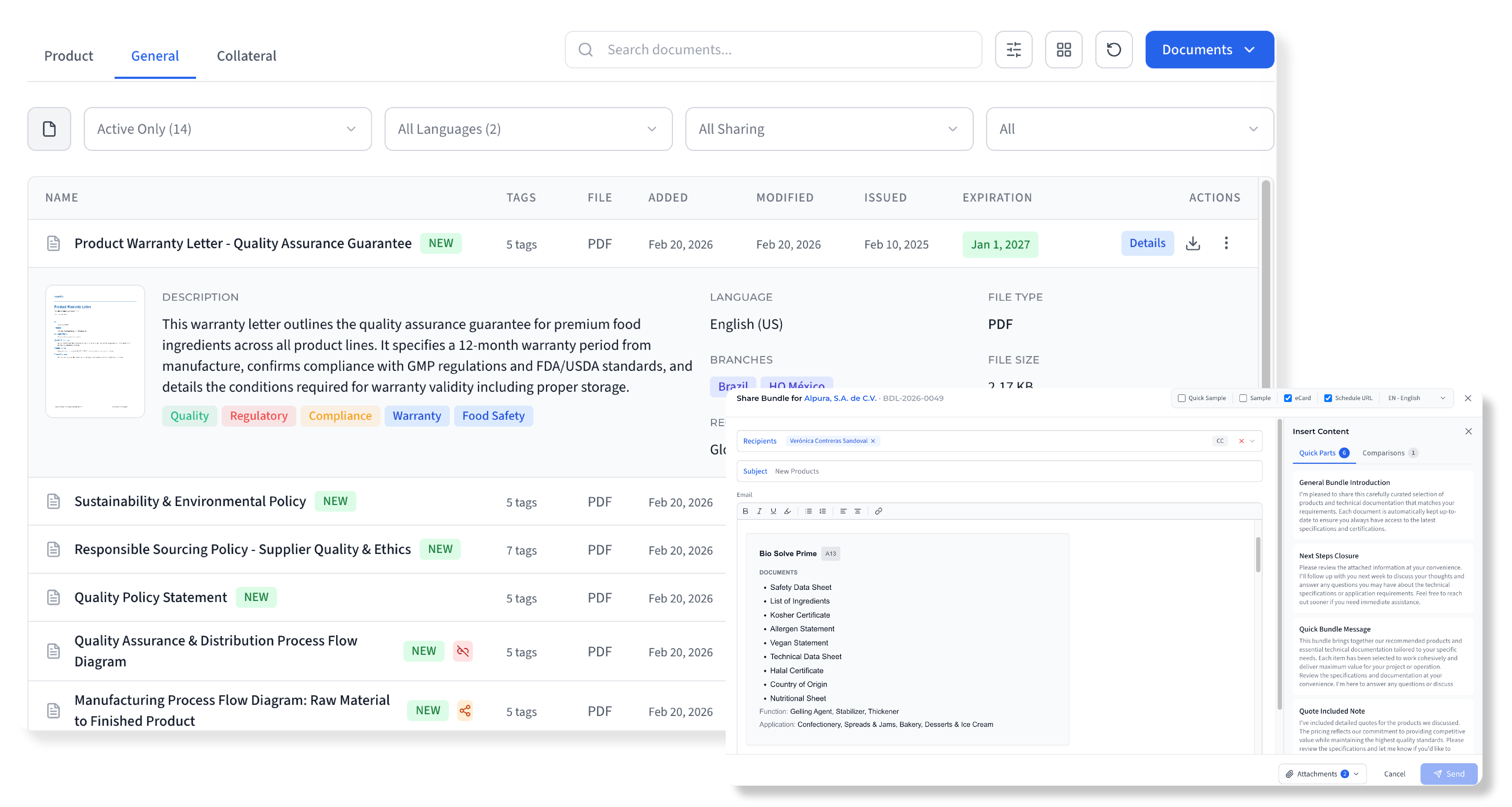 Food ingredient sales teams juggle product specifications, allergen declarations, certifications (Halal, Kosher, organic), regulatory documents, and marketing collateral for hundreds of products across dozens of client presentations. handify bundles bring all of this together: your food ingredient catalog, its technical documents, and your marketing content in one shareable link. When you update a COA or certification, every bundle that includes it updates automatically — so reps stop spending half their day on document assembly.